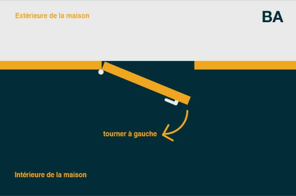 Les portes pivotant à gauche ont les paumelles vers l’intérieur à gauche et la poignée  à droite. (Il s’agit d’une porte de gauche.)